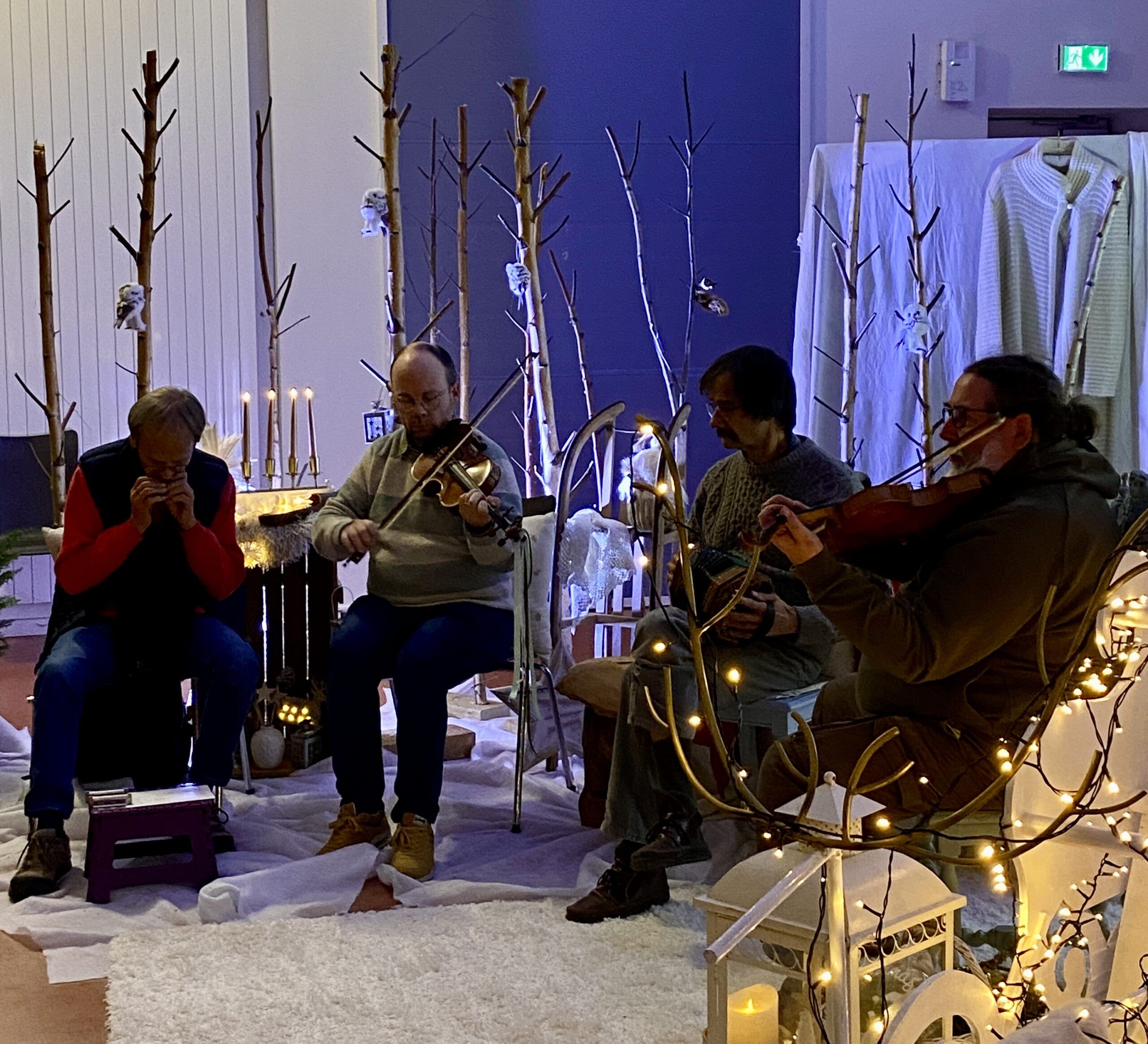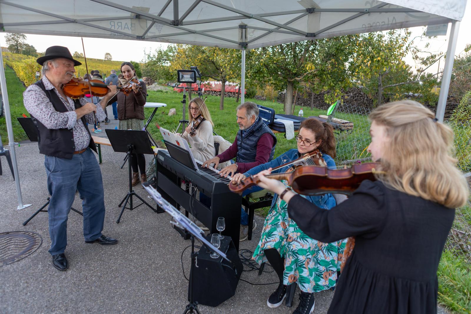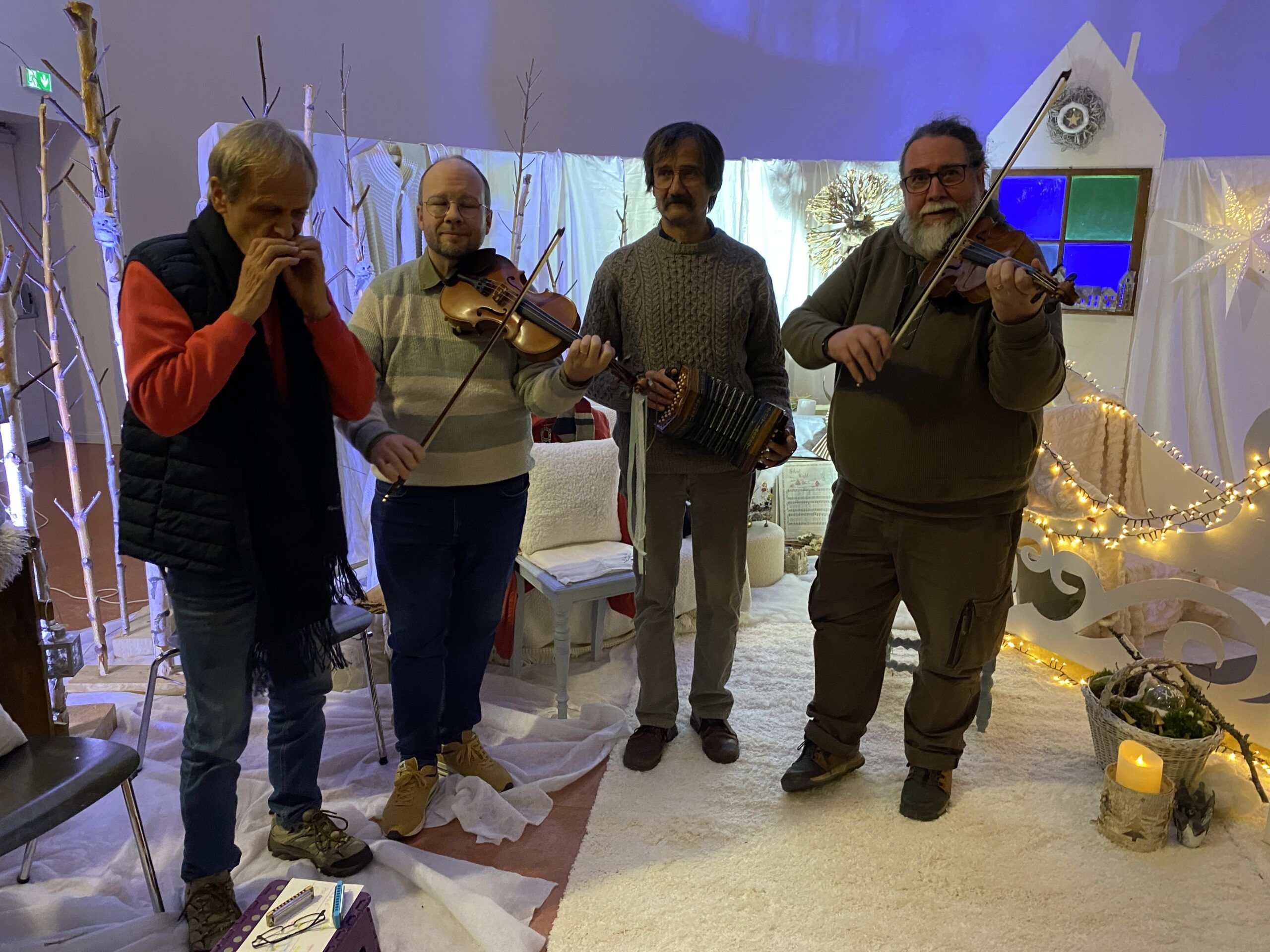 Inauguration du marché à Salle Arthus mise en beauté par Alexandra Klein, membre de notre conseil d’administration. Et mise en musique par notre professeur Sylvain Guehl, et quelques membres de son atelier de Musiques traditionnelles avec violon, harmonica et un instrument très étonnant : le concertina – danses scandinaves, irlandaises et alsaciennes.